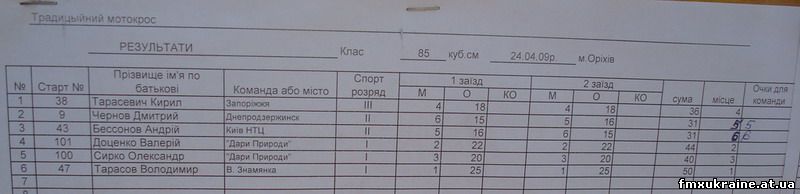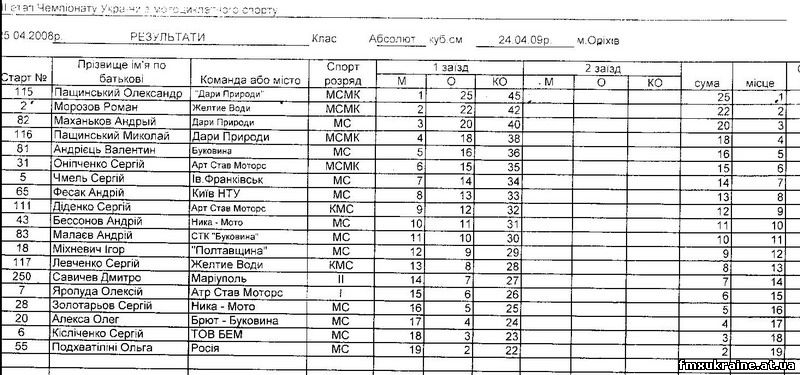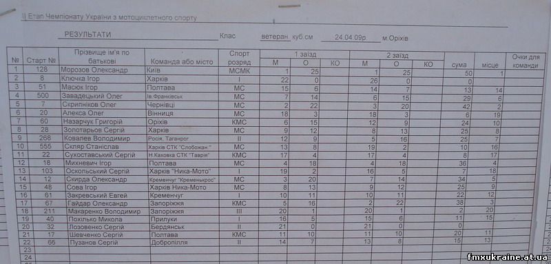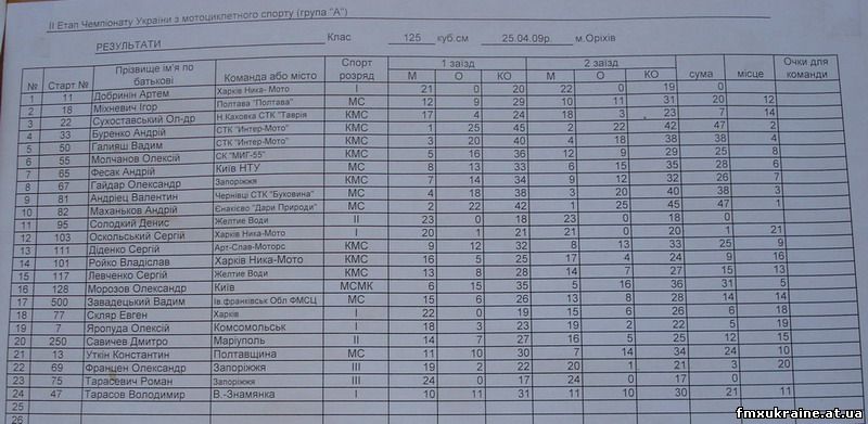 Впервые во взрослом Чемпионате Украины выступал представитель нашей команды Дмитрий Савичев (Мариуполь). Два года он занимается мотокроссом и до этого принимал участия только в любительских чемпионатах. Первая проба попробовать свои силы с мастерами молодежного Чемпионата прошла в Запорожье в начале апреля этого года. В Орехово Дмитрий Савичев проявил инициативу, отказавшись от участия в заезде любителей, где мог расчитывать на призовое место и заявился в заезде 125 Чемпионата Украины. В заезде участвовало 24 спортсмена: В первом заезде гонки Дима был на 10 позиции, однако из-за падения оказался в общем на 15 месте.